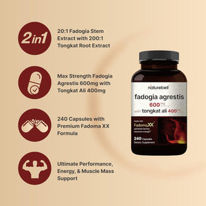 Extracto de fadogia agrestist altamente concentrado 2 en 1 de NatureBell de 600 mg, combinado con un extracto de tongkat ali de Indonesia de 400 mg creado con la potente fórmula especial a base de plantas Fadoma XX.
