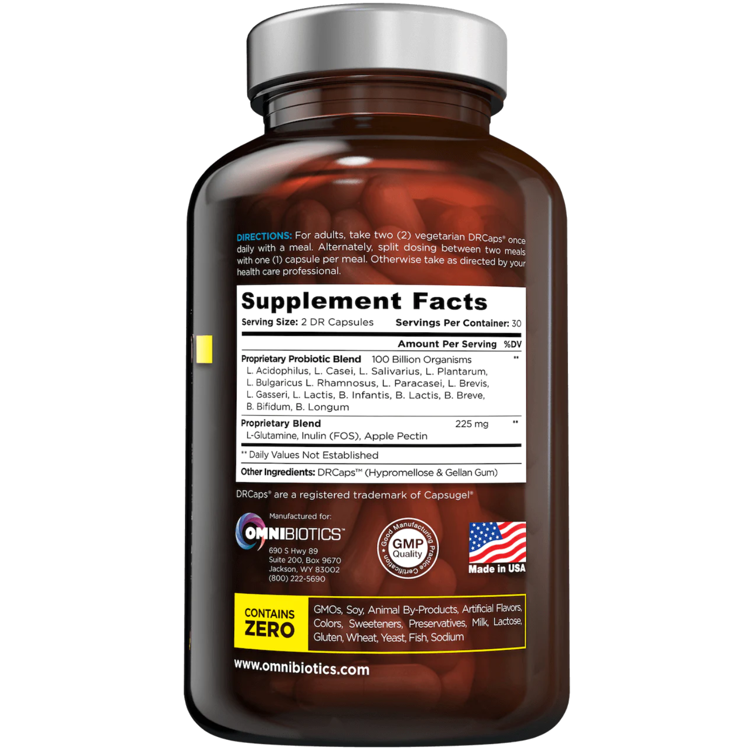 Probióticos veganos no transgénicos de grado profesional sin: aglutinantes, soja, gluten, leche, huevo, trigo, maní, mariscos, aditivos o conservantes.
