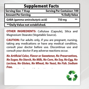 BEST NATURALS 750 mg de Gaba por cápsula vegetariana - 100 cápsulas por botella.