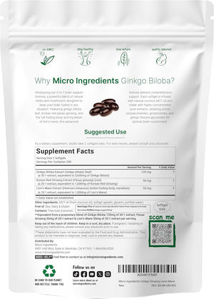 - Micro Ingredients ofrece una fórmula de gel blando de apoyo cerebral 3 en 1 altamente concentrada con ginkgo biloba, panax ginseng rojo coreano y extractos de micelio y cuerpo fructífero de melena de león de espectro completo.