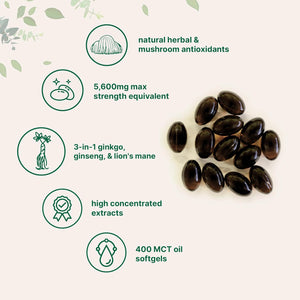 - Las cápsulas blandas se infunden con aceite MCT natural de coco para mejorar la absorción y biodisponibilidad de los extractos botánicos, entregando compuestos activos clave como polisacáridos, ginsenósidos y glicósidos de flavona de ginkgo.