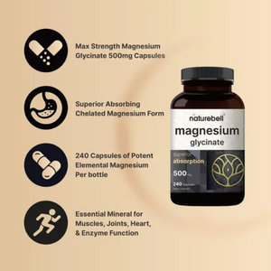 El suplemento NATUREBELL Glicinato Magnesium apoya la densidad ósea, promueve la relajación de los músculos, reduce la frecuencia de los calambres en las piernas, ayuda a mantener un ritmo cardíaco normal y apoya la salud cardiovascular general y la producción de energía