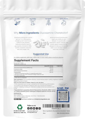 - Micro Ingredients ofrece un complejo de salud articular 7 en 1 de glucosamina, condroitina, MSM y cúrcuma con apoyo adicional de Boswellia, ácido hialurónico y colágeno. Una fórmula de tableta bisecada para un fácil consumo y beneficios duraderos.