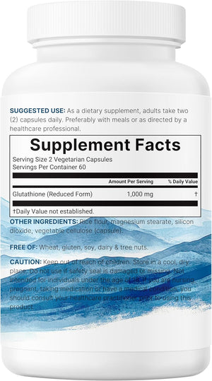 Cada botella incluye 120 cápsulas vegetales naturales para un suministro completo de 60 días. 2 cápsulas por porción proporcionan 1,000 mg de glutatión reducido de alta calidad para el equilibrio diario.