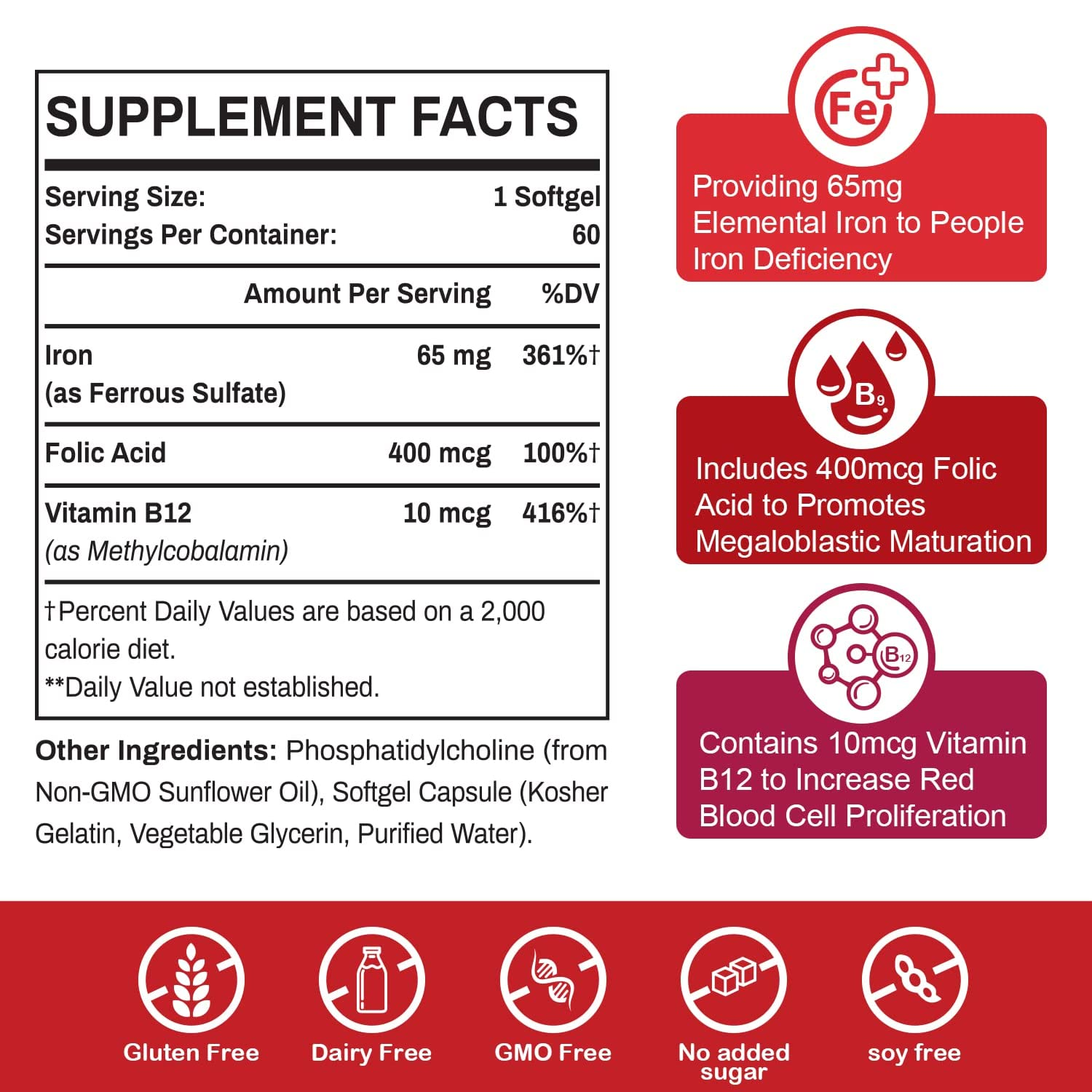 Prevención y tratamiento de la deficiencia de hierro, ayudar a prevenir y tratar la deficiencia de hierro. La deficiencia de hierro puede causar anemia, fatiga, debilidad y dificultad para concentrarse, por lo que el suplemento puede ayudar a corregir estos problemas.