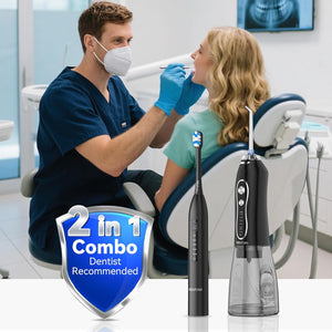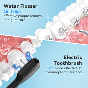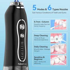 - Kit de limpieza oral 2 en 1: potencia de limpieza profunda, mejor que usar cualquiera de los dos solos. Este juego combinado premium incluye el cepillo de dientes sónico H2ofloss y el irrigador dental inalámbrico. Usados juntos, eliminan más placa que cepillarse o usar hilo dental solos, brindando una sonrisa más fresca y saludable.