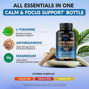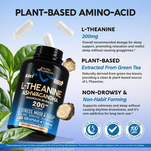 L-teanina 200mg - Desarrollado por Ashwagandha. Relajación y sueño de calidad en cada cápsula. Experimenta el equilibrio perfecto de calma y concentración con nuestras cápsulas de L-teanina de 200 mg, sobrealimentadas con Ashwagandha para una mayor eficacia. Fórmula a base de plantas formulada para ayudarte a dormir, aliviar el estrés, el estado de ánimo y la nitidez sin somnolencia, ofreciendo relajación natural.