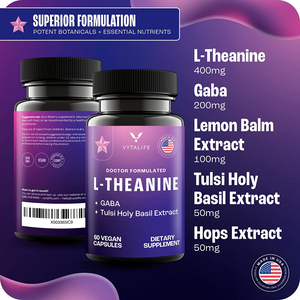 Apoyo inmunológico general: las pastillas de L-teanina de Vytalife están formuladas con extracto de gaba y bálsamo de limón para un mejor estado de ánimo, extracto de albahaca sagrada para calma y extracto de lúpulo, que puede ayudar a obtener la mente en paz.