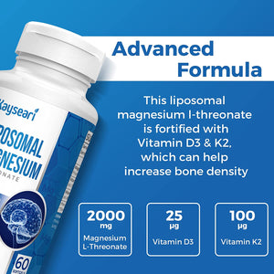 Fórmula avanzada Este l-treonato de magnesio liposomal está fortificado con vitamina D3 y K2. Trabajan juntos para ayudar a convertir el calcio en su forma activa en el cuerpo, para que los huesos puedan absorber más calcio de manera eficiente, lo que puede mejorar la densidad ósea y promover el crecimiento óseo.
