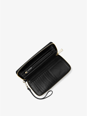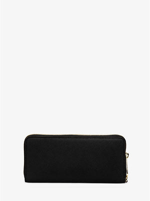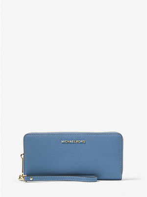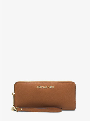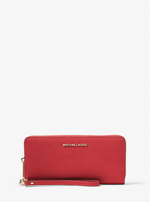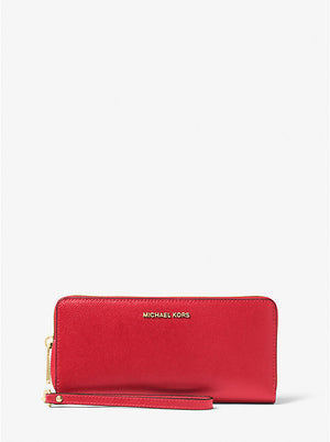 Con un tono atemporal y una textura ultralujosa, querrás tener a mano nuestra billetera Jet Set Travel. Fabricada en piel Saffiano, este accesorio clásico presenta una forma alargada con detalles en tono dorado y un cierre de cremallera continental.