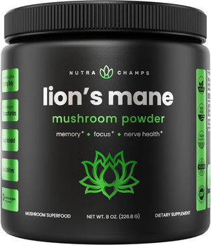 Potente apoyo cerebral: eleva tu rendimiento cognitivo con el polvo de hongos melena de león NutraChamps Nuestra fórmula de 2000 mg por porción está diseñada para apoyar la memoria, el enfoque y la salud general del cerebro, por lo que es el suplemento nootrópico óptimo.