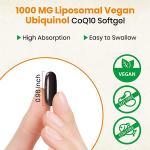 Salud del corazón y gestión de la energía: el suplemento CoQ10 ubiquinol juega un papel en la producción de la energía necesaria por nuestros corazones. Los niveles Co Q10 en el corazón y el cuerpo pueden comenzar a disminuir naturalmente hasta un 60% después de los 40 años. Nuestro suplemento liposomal de coq10 ubiquinol de 1000 mg puede reponer CoQ 10 en los músculos cardíacos para mantener niveles de energía óptimos.