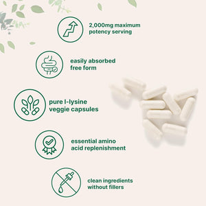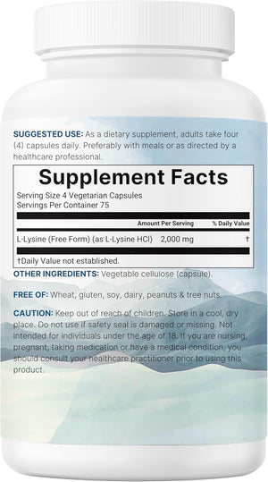 Cada botella incluye 300 cápsulas vegetales naturales, proporcionando 2,000 mg de L-lisina de máxima potencia como clorhidrato de L-lisina (HCl) por porción.