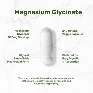 Dosis y porciones: solo 1 cápsula vegetariana por porción para recibir 500 mg de glicinato de magnesio puro. Cada botella ofrece 240* cápsulas vegetales y un suministro de hasta 8 meses.