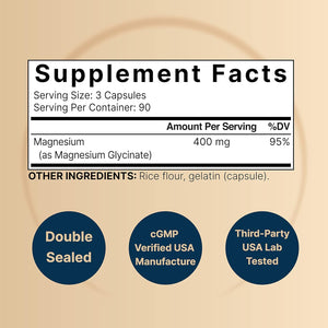 Porciones de cápsulas de glicinato de magnesio extra fuerte 400 mg. Magnesio quelado y purificado absorbente superior. Forma de glicinato biodisponible más alta.