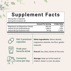 Cada bolsa ofrece 240 cápsulas, un tamaño de porción de 3 cápsulas y un suministro de hasta 3 meses. Incluye citrato de magnesio de grado superior 400 mg con 1.000 iu de vitamina D3 como colecalciferol y 30 mg de vitamina B6 como piridoxina HCI por dosis.