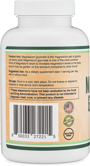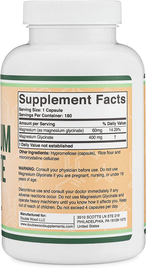 MAGNESIUM GLYCINATE ALTA CALIDAD SUMINISTRO PARA SEIS MESES: el suplemento de 400 mg de glicinato de magnesio de Double Wood contiene 180 cápsulas de 400 mg cada una. Porciones suficientes para durar 6 meses.