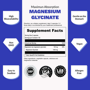 Apoya la función muscular: el magnesio es un mineral esencial que ayuda a apoyar la función muscular normal y ayuda a la defensa de calambres en las piernas. El glicinato mag altamente absorbente apoya la presión arterial saludable.