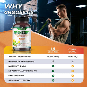 MALATO DE MAGNESIO, GLICINATO, CITRATO CON ZINC Y VITAMINA C 9 EN 1 6850 MG 150 CÁPSULAS NO GMO VEGAN ULTRA HERBS