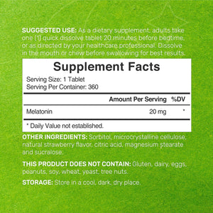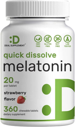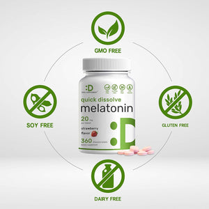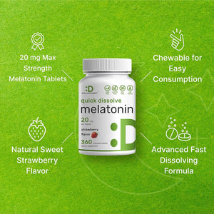 - Características especiales: tabletas de melatonina disolubles rápidas avanzadas de fuerza máxima de 20 mg. Una fórmula vegana al día que viene en un relajante sabor natural a fresa. Masticable para un fácil consumo y absorción eficiente.