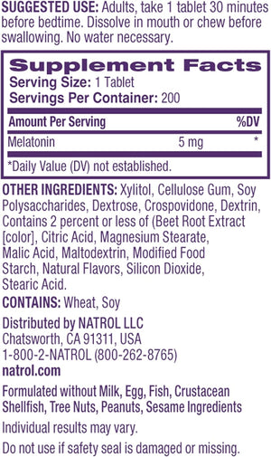 Suplementos para dormir: una botella de 200 unidades de tabletas Natrol de melatonina de 5 mg con sabor a fresa, de disolución rápida para un suministro de 200 días