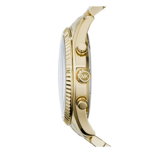 Un anillo superior texturizado agrega un atractivo llamativo al reloj cronógrafo Michael Kors Lexington de acero inoxidable en tono dorado.