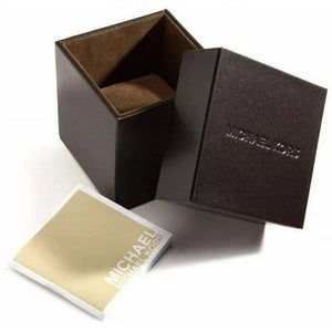 Este reloj Michael Kors Lexington presenta una esfera pavé dorada con tres subesferas negras e índices en tono dorado, movimiento de cronógrafo y brazalete de acero inoxidable en tono dorado.