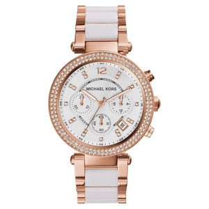 Elegante y pulida, la caja de acero inoxidable en tono oro rosa contrasta con una esfera de cronógrafo opalina. Los eslabones exteriores en tono oro rosa brillante se combinan con los eslabones centrales de resina blanca para lograr un estilo elegante de dos tonos al estilo Michael Kors. Un anillo superior brillante agrega la cantidad perfecta de brillo.