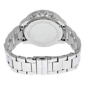 El reloj Wren de 42 mm de Michael Kors presenta una esfera blanca con efecto rayos de sol, movimiento de cronógrafo y pulsera de acero inoxidable.