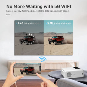 - Conexión inalámbrica de 2.4 G + 5 G: conecta y mira con un solo clic El proyector portátil soporta WiFi 5G y 2.4G. Espejo de pantalla fácilmente desde tu smartphone o cualquier otro dispositivo habilitado para Miracast. Te proporciona una imagen y videos realmente inmersivos, sin esfuerzo. Nota: el contenido protegido por derechos de autor de Hulu, Netflix, Xfinity y servicios similares no se puede duplicar ni serigrafiar.