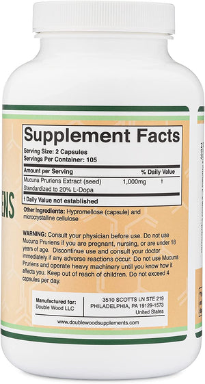 Fabricado y probado en los Estados Unidos: las cápsulas de extracto de Mucuna Pruriens de DoubleWood Supplement se fabrican y prueban para detectar microbios y metales pesados aquí en los Estados Unidos