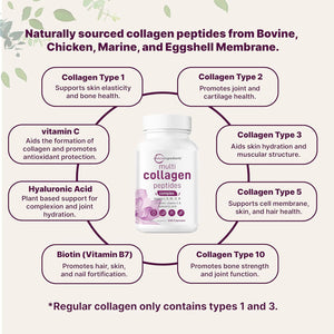 Micro Ingredients ofrece cápsulas de péptidos de colágeno de espectro completo 8 en 1. El complejo antienvejecimiento definitivo que proporciona péptidos de colágeno criados en pastos puros. Fabricado con colágeno hidrolizado de primera calidad para una absorción completa y eficiente que nutre el cabello, la piel, las uñas y las articulaciones.