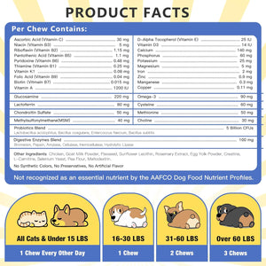 PARA TODAS LAS EDADES: Las multivitaminas para perros son adecuadas para la absorción de nutrientes de perros jóvenes, la pérdida de nutrientes en la vejez y el apoyo general de gatos y perros en todas las etapas de desarrollo. Las vitaminas para perros son libres de gluten, soja, maíz, sin OMG, suplementos 12 en 1 para la salud general, todas las fuentes son naturales y fabricadas en los Estados Unidos.