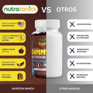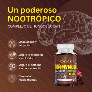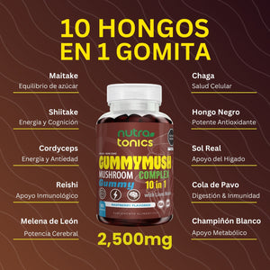 MUSHROOM COMPLEX 2,500 MG HONGOS 10 EN 1 GUMMYMUSH 90 GOMITAS NUTRARTONICS CON MELENA DE LEÓN, CORDYCEPS, COLA DE PAVO VEGANO, NO GMO, SIN GLUTEN