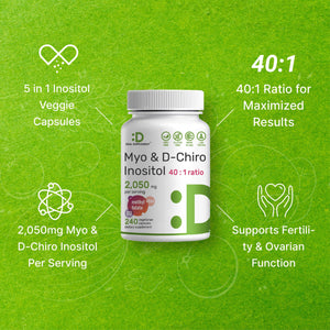 Características especiales: proporción 40:1 de mioinositol y D-chiro inositol, complejo 5 en 1, cápsulas vegetarianas premium con folato, vitamina D3 y baya Vitex añadidos.