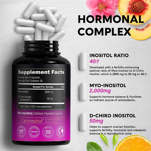 Los estudios han demostrado que el inositol (mioinositol) combinado con D-Chiro-Inositol puede ayudar a mejorar el equilibrio hormonal, la función ovárica, la calidad del huevo y apoyar el sistema reproductivo femenino.