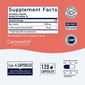 está formulado en una proporción 40:1 de mioinositol a d-chiro-inositol. Los ensayos y estudios clínicos han demostrado que esta relación específica es la más efectiva.† Las cápsulas proporcionan un método superior de suplementación, ya que el mYO inositol no es tan fácilmente absorbido por el cuerpo cuando se toma en polvo.