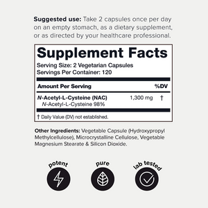 La forma altamente purificada de NAC: los lotes son probados en laboratorio de terceros para garantizar un mínimo del 98% de pureza en cada porción, lo que significa que no solo está obteniendo la dosis más alta de n acetil cisteína, sino también la más pura (la mayoría de los otros suplementos de n-acetil cisteína y nac no revelarán sus niveles de pureza).