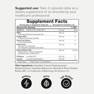 Mezcla de fórmula única: NAD+ de Toniiq combina NAD+, resveratrol, niacina y el RiaGev-WS patentado. Esta mezcla única garantiza que obtengas un enfoque integral para aumentar los niveles de NAD+.