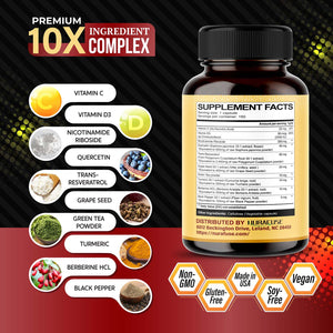 Fórmula 10 en 1: Este suplemento combina 10 ingredientes activos, incluyendo Quercetina y Resveratrol, para ofrecer un enfoque completo al bienestar general, ayudando a optimizar múltiples aspectos de la salud.