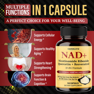 El suplemento NAD Nicotinamida Riboside + Quercetin + Resveratrol 10 en 1 es una fórmula avanzada diseñada para promover la longevidad, aumentar la energía celular y apoyar la salud cardiovascular y antioxidante. Cada cápsula contiene una poderosa combinación de ingredientes clave como la Nicotinamida Riboside (NR), un precursor del NAD+ que optimiza el metabolismo energético, junto con Quercetina y Resveratrol, conocidos por sus propiedades antioxidantes y antienvejecimiento.