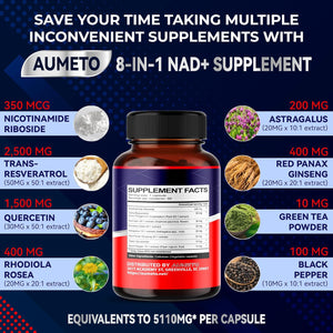 Ingredientes de alta calidad: Aumeto NAD está fabricado con meticulosa precisión para aprovechar el máximo potencial de ingredientes altamente concentrados como extracto de quercetina 50:1, extracto de Rhodiola rosea 20:1, extracto de astrágalo 10:1, extracto de Panax Ginseng rojo 20:1 y extracto de pimienta negra 10:1, asegurando una eficacia inigualable en comparación con otros productos en el mercado. En lugar de tener que usar 5 suplementos diferentes, solo Aumeto NAD cada día muestra una diferencia completa.