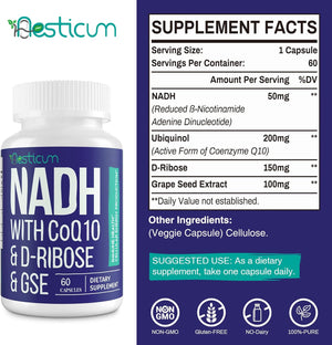 NADH 50 MG CON COQ10 200 MG Y RIBOSIDE 150 MG 60 CAPSULAS SIN GMO NESTICUM