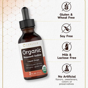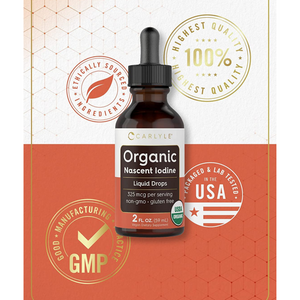 El yodo nasal Carlyle es una forma premium de este oligoelemento esencial. Nuestro suplemento proporciona 325 mcg de yodo en solo dos gotas de líquido, lo que equivale al 217% de tu valor diario Es naturalmente sin OMG y sin gluten, certificado orgánico y fácil de añadir al agua o a tu jugo favorito, complementando cualquier rutina diaria.