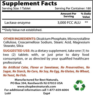 NATURAL ENZIMAS LACTASA 3000 FCC 180 TABLETAS BEST NATURALS