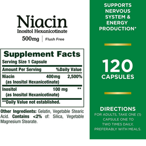 Cápsula sin descarga Apoya la producción de energía celular y la salud del sistema nervioso con las cápsulas sin descarga de Nature's Bounty Niacin de 500 mg. La niacina como hexanicotinato de inositol también se conoce como niacina sin enjuague, lo que significa que nuestra fórmula es menos probable que cause enjuague de la piel. Además de apoyar la salud del corazón y la salud del sistema nervioso, la niacina ayuda a apoyar la energía ayudando a la conversión de alimentos en energía.