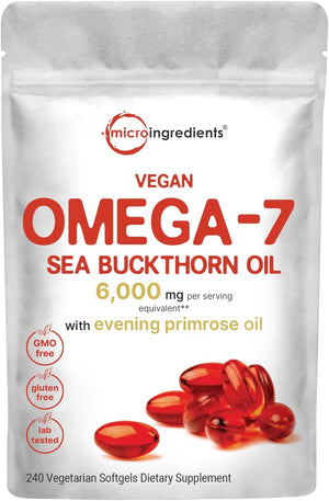 Micro Ingredients ofrece una fórmula vegana de aceite de espino cerval de mar Omega-7 que cuenta con un equivalente de 6,000 mg de extracto de fruta de espino amarillo combinado con aceite de onagra prensado en frío para un apoyo diario 2 en 1.