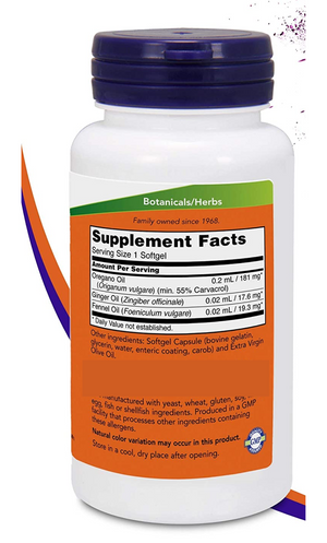 ACEITE DE OREGANO 181 MG + ACEITE DE JENGIBRE 17.6 MG + ACEITE DE HINOJO 19.3 MG 180 CAPSULAS BLANDAS SIN GMO NOW