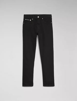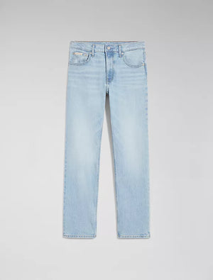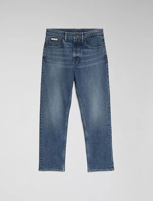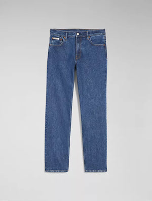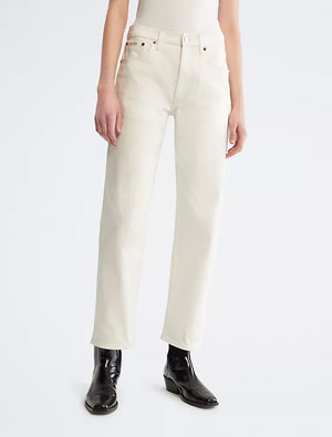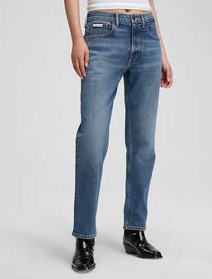 Estos jeans tienen una cintura de tiro medio y un corte recto. Están confeccionados con bragueta con cremallera y cierre de botón en la parte superior. Presentan detalles de costuras y están diseñados con herrajes metálicos con el logotipo de la marca. Están rematados con un parche con el logotipo de Calvin Klein en la parte posterior de la cintura.