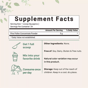 Mejora de la energía y resistencia: El polen de pino aumenta la energía y la resistencia física. Se cree que los nutrientes y compuestos bioactivos presentes en el polen de pino pueden ayudar a mejorar la resistencia, la vitalidad y la capacidad de recuperación.